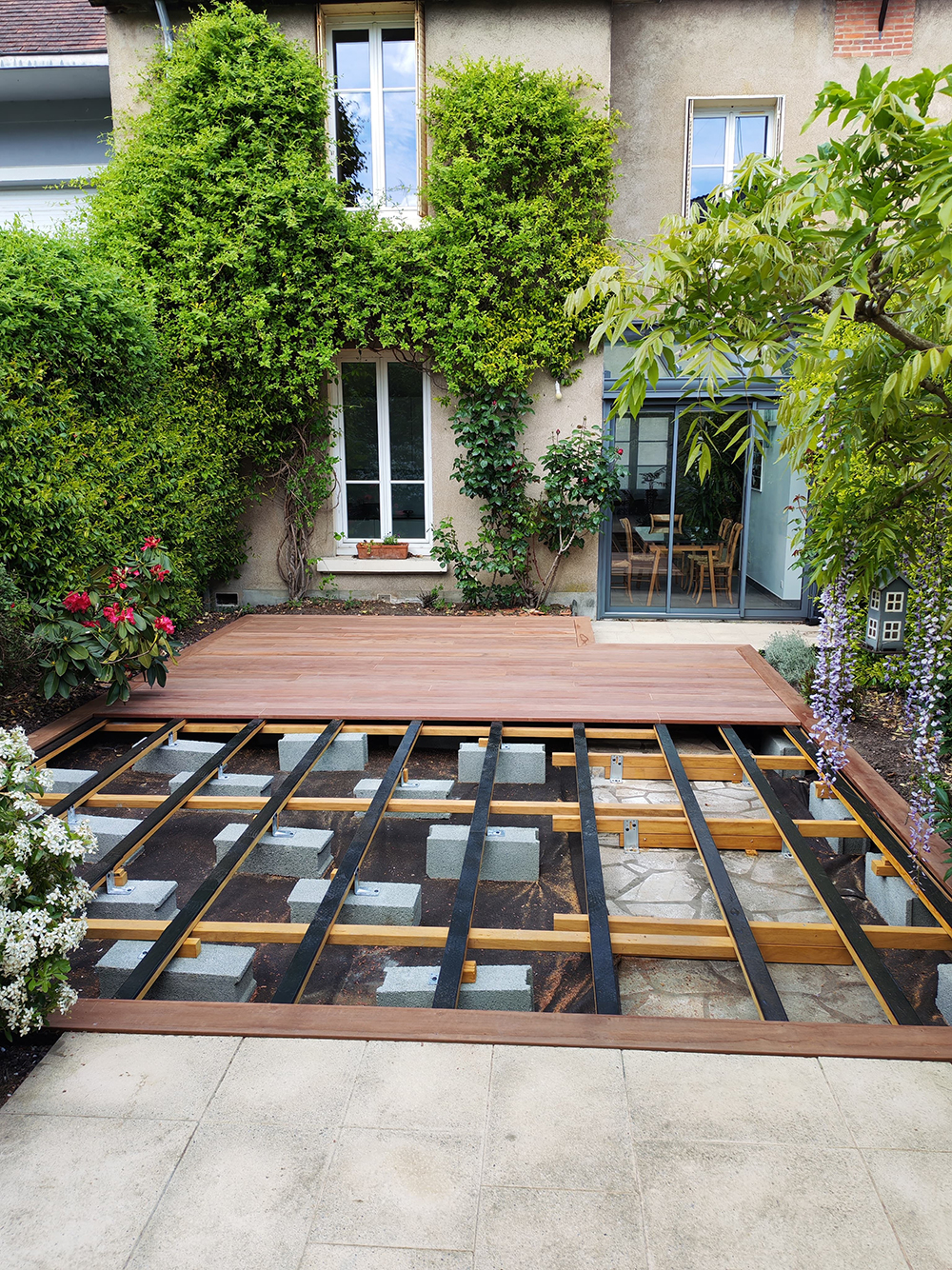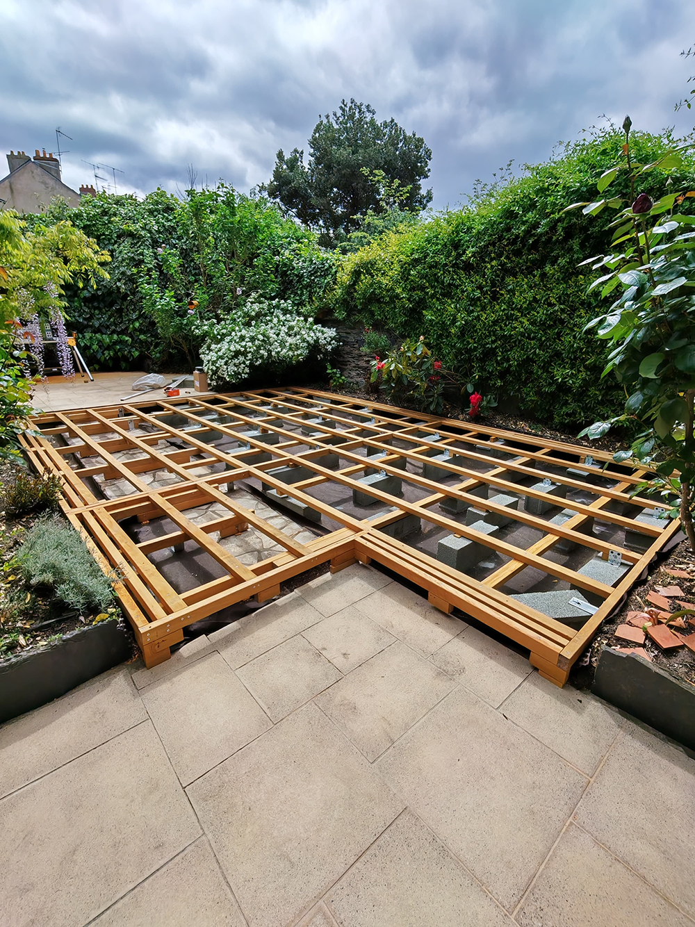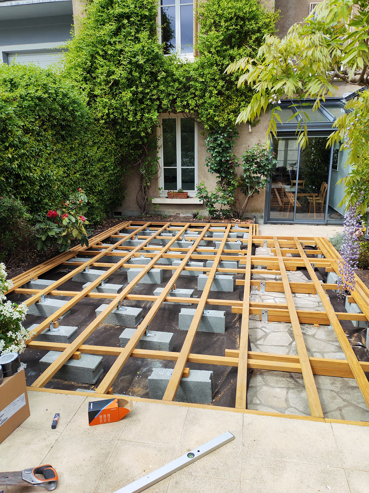 Contrairement à une pose classique sur plots réglables, cette terrasse repose sur une structure renforcée :