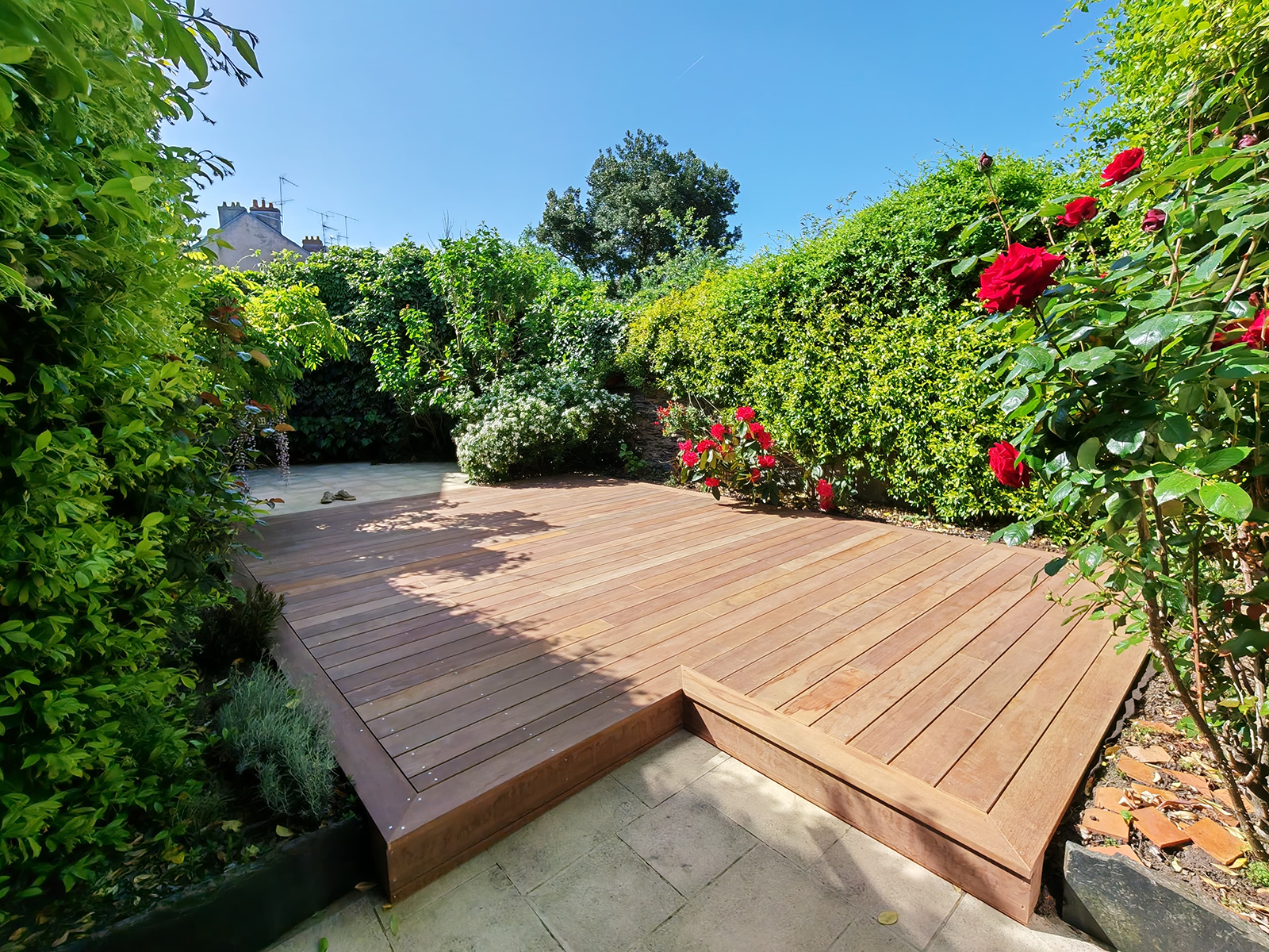 Pour ce projet situé à Angers, Le Charpentier Créateur a réalisé une terrasse en bois exotique de 28 m², conçue pour allier esthétique, confort et durabilité. Le choix du massaranduba, essence exotique reconnue pour sa densité et sa résistance naturelle, garantit une excellente tenue dans le temps, même face aux variations climatiques.